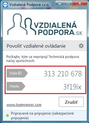 Program TeamViewer sa spustí. Pri každom spustení sa vygeneruje vždy jedinečné 6 miestne heslo. Vaše ID spolu s heslom nadiktujete pracovníkovi Vzdialenej Podpory do telefónu.