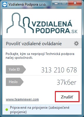 Pre ukončenie programu TeamViewer kliknite na tlačítko Zrušiť.